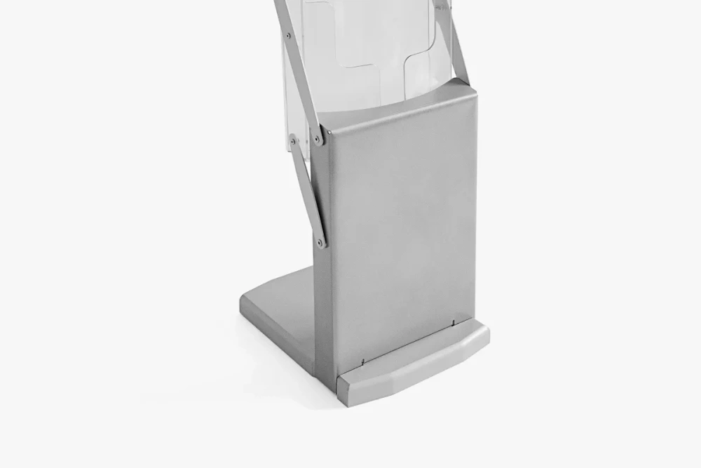 The brochure stand is made of anodized aluminum and acrylic glass. These materials ensure the product will serve you for a long time while maintaining an aesthetic appearance.