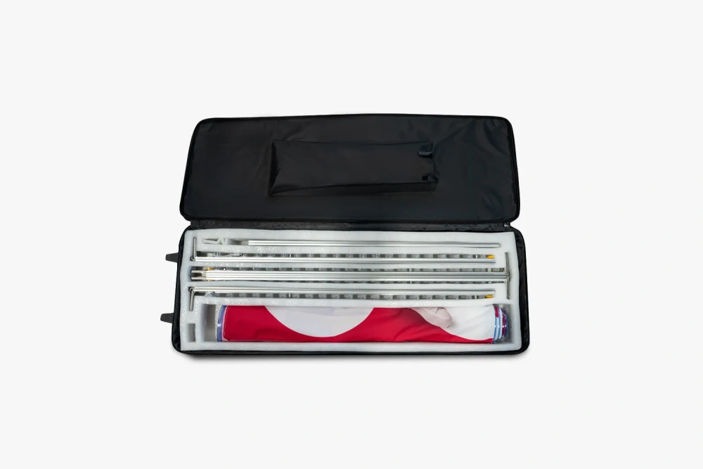 The adFrame Battery model features wheels at the base. You can easily bring it onto a conference stage or move it from one promotional point to another. The lightbox comes with a handy wheeled bag, facilitating transport and protecting the product from damage.