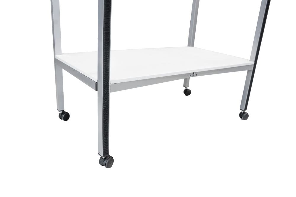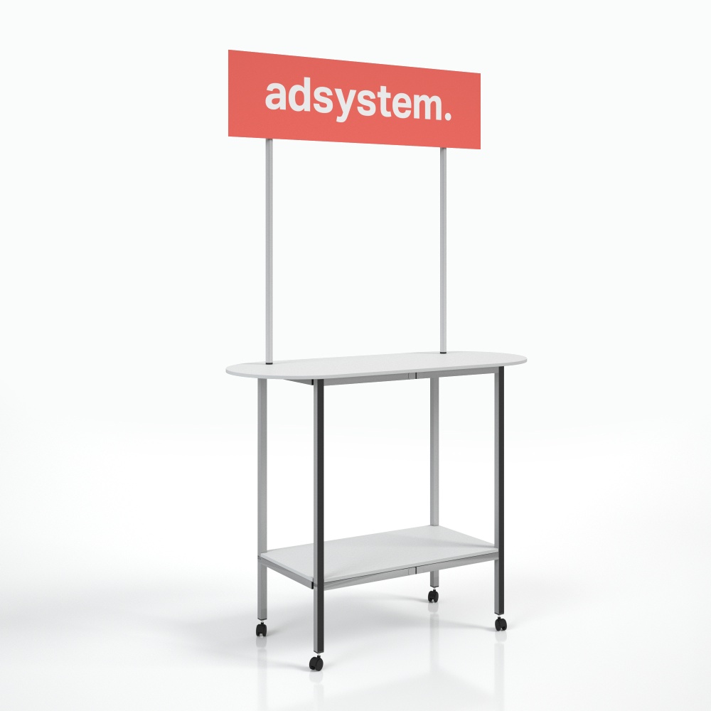 The adBox Elypse is built with aluminum profiles and a high-quality tabletop, available in a palette of colors to choose from. Its sturdy base supports up to 100 kg, making it ideal for promoting larger products. Additionally, the stand is equipped with wheels, allowing for effortless relocation.