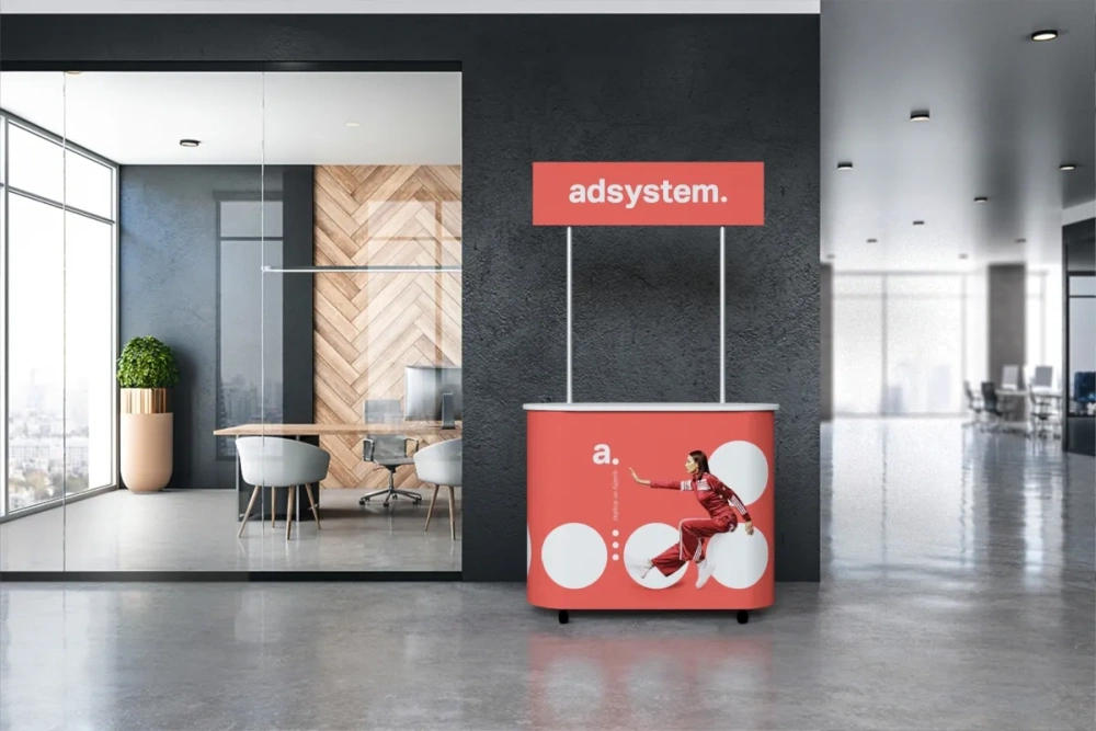The adBox Elypse model stands out for its quick, tool-free assembly. Its modular construction allows the stand to be set up in just a few minutes. After the event, it can be easily disassembled and stored in a convenient carrying bag.
