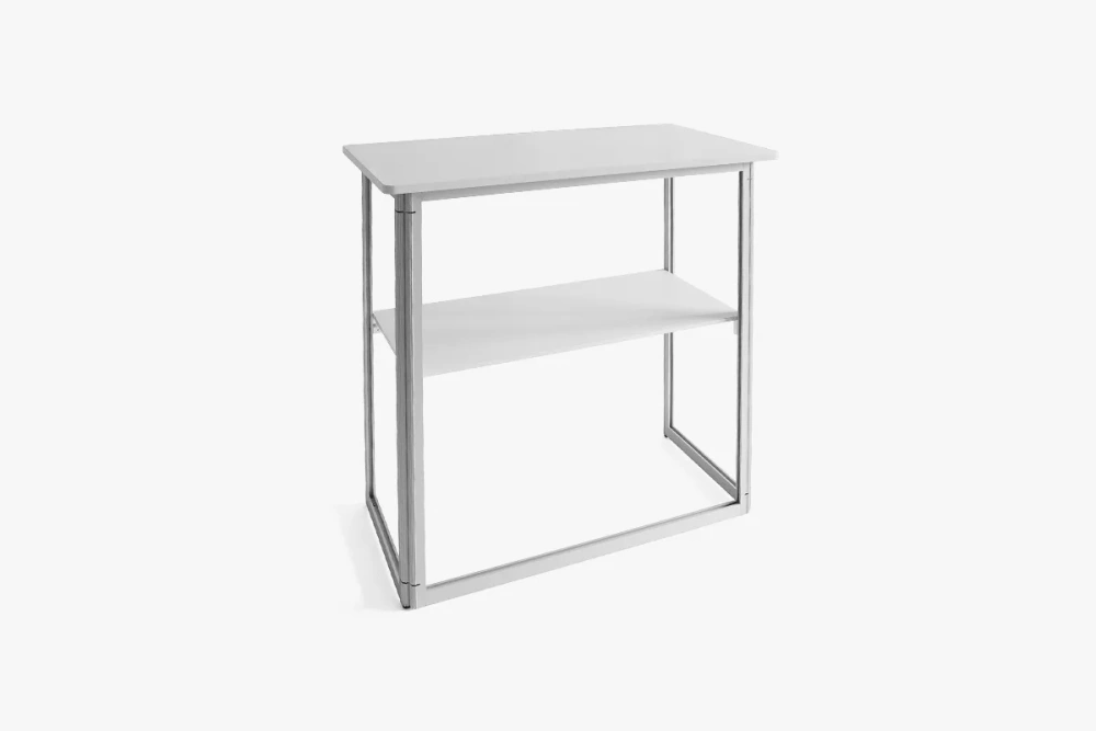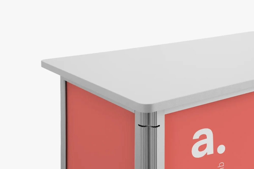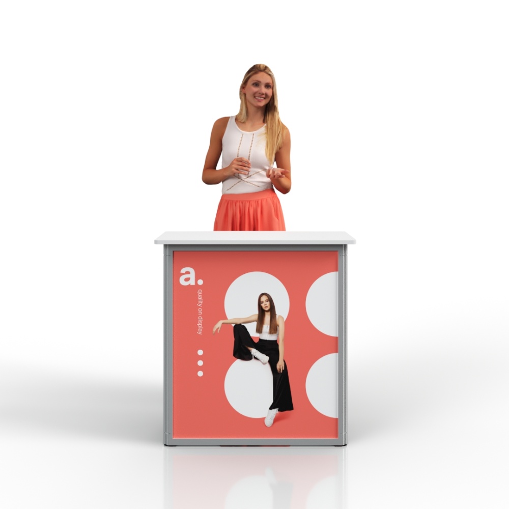 The adTribune Standard counter features quick and easy assembly. Printed graphics are pre-placed in aluminum frames, allowing for immediate booth preparation. Simply remove the counter from the transport bag, unfold the sides of the structure, and lock them with the shelf and countertop. This saves valuable time during the event.