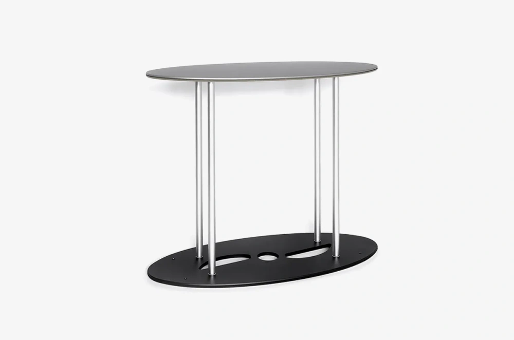 The oval shape is not only elegant in design but also promotes interaction. Presented materials are easily accessible from all sides, encouraging potential customers to approach the table.