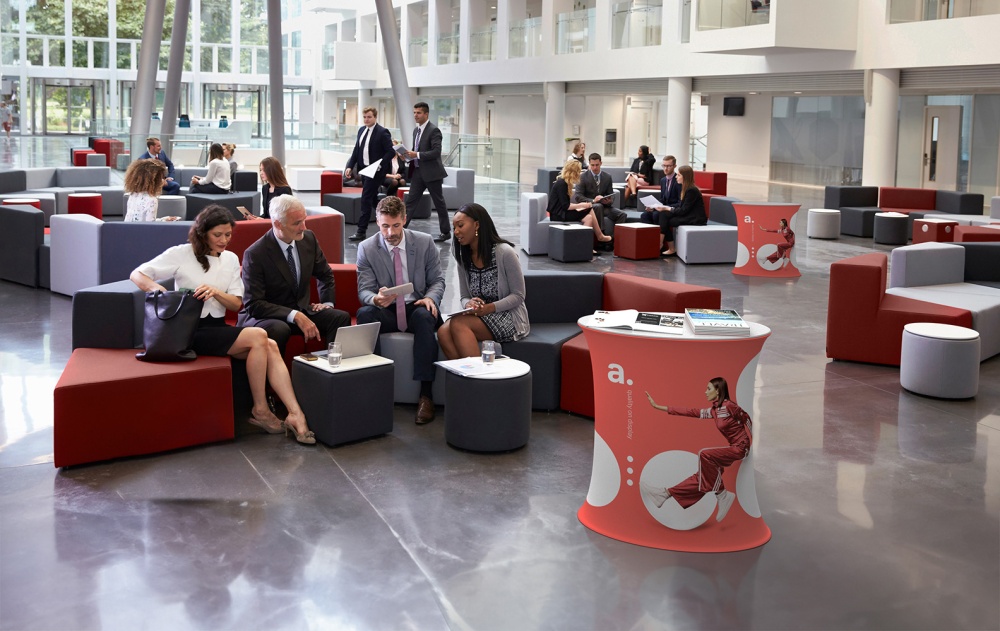 With its oval shape, the Stand Counter adTribune Oval stands out compared to traditional rectangular furniture. The oval design encourages interaction by providing easier access to displayed materials from all sides, enhancing usability and encouraging potential customers to engage with the brand.