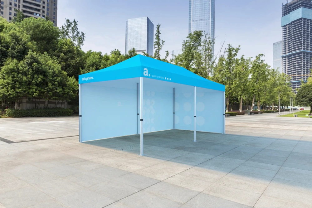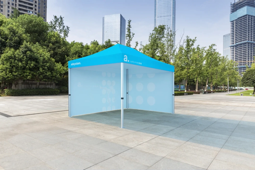 What Are the Benefits of adTent Express Customized Tents? Customized tents for events are among the most sought-after products on the market and offer numerous advantages. Discover why you should choose adsystem’s tents. Protection from Sun and RainThese tents are designed to protect you from adverse weather conditions. The fabric used for the roof and side walls is waterproof, preventing moisture from passing through. Additionally, the material partially blocks sunlight, providing extra comfort even on sunny days. Tents as Advertising ToolsThe adTent Express customized tents are also highly effective advertising tools. The roof and side walls can be personalized with your brand’s graphics, helping to highlight your logo and reinforce your brand identity among your customers. Using advanced printing technologies, we deliver high-quality images with vibrant colors, making the tents an excellent promotional asset. Quick and Easy Setup SystemThe adTent Express tents stand out for their simple and intuitive assembly system. The top part of the structure consists of aluminum rods in an accordion design, which allows the roof to open automatically as you extend the legs of the tent outward. Setup can be done by just two people without the need for any tools, making the process quick and efficient. Available in Various SizesAt adsystem, we understand that every customer has specific needs. That’s why we offer customized tents in various sizes, including popular options like 3x3 m and 3x6 m, catering to events of different scales and types. Where to Use adTent Express Customized Tents? The advent Express customized tents are versatile solutions that can be used in various contexts, both outdoors and indoors. Outdoor EventsIdeal for festivals, concerts, and outdoor promotions, these tents provide sun protection while creating a visible brand presence at the event. In large venues, a 3x3 m customized tent can serve as a reference point for participants. Indoor EventsThese tents are also an excellent solution for trade shows and events held in indoor spaces, such as large pavilions. The material used for the side walls and roof is certified fire-resistant, ensuring safety in enclosed environments. Technical Specifications: Height: 340 cm Width: 300 cm Depth: 300 cm Unit Weight: 26 kg Applications: Stand elements Concerts and festivals Sports events Promotions and marketing campaigns Key Product Features: Tool-free assembly Suitable for indoor and outdoor use Reusable structure