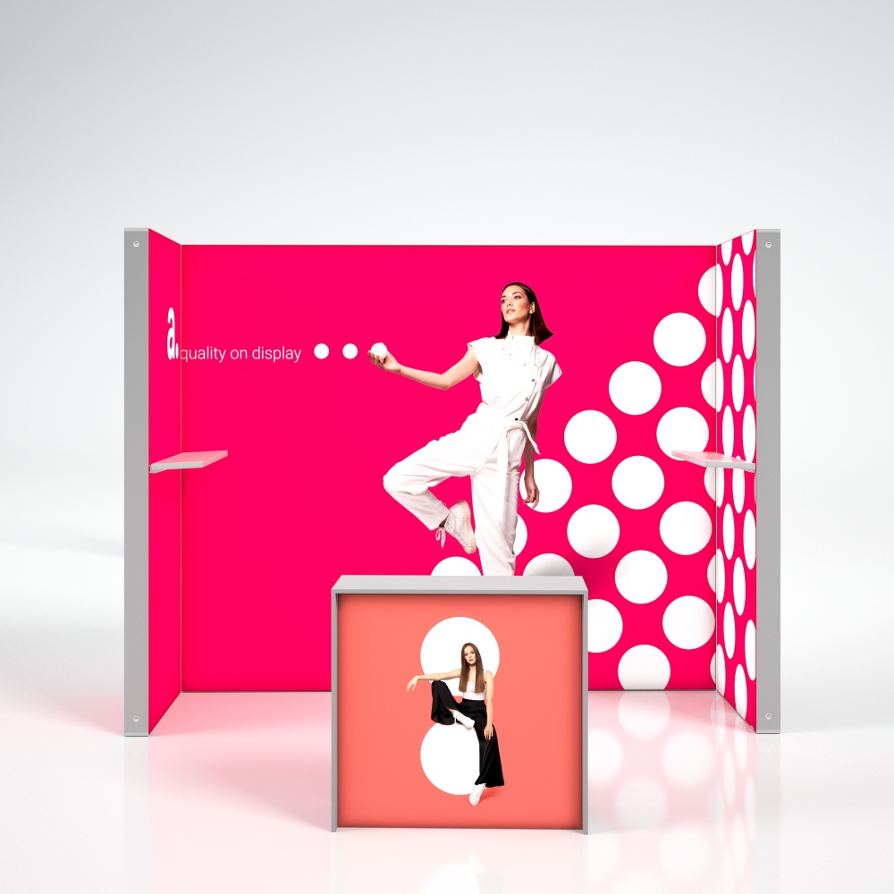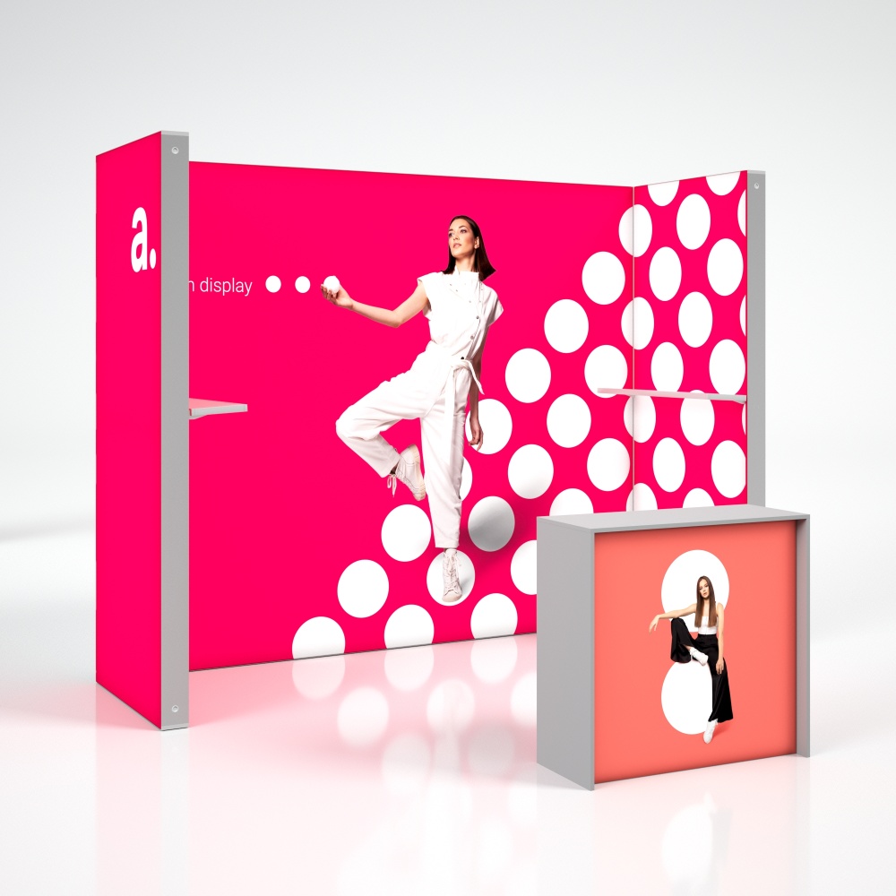 Thanks to the modular design of the set, you can easily adapt the booth to different exhibition spaces. The lightboxes can be connected at various angles – 90 or 180 degrees – allowing for unique configurations tailored to the specifics of the event. Depending on your needs, the set can be expanded or reduced, providing full flexibility.