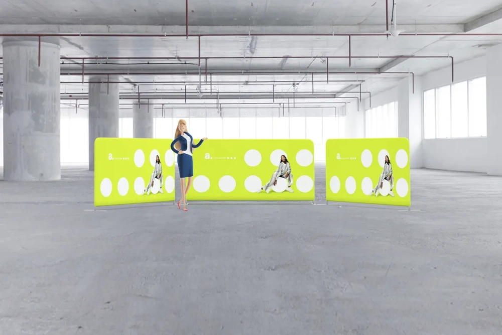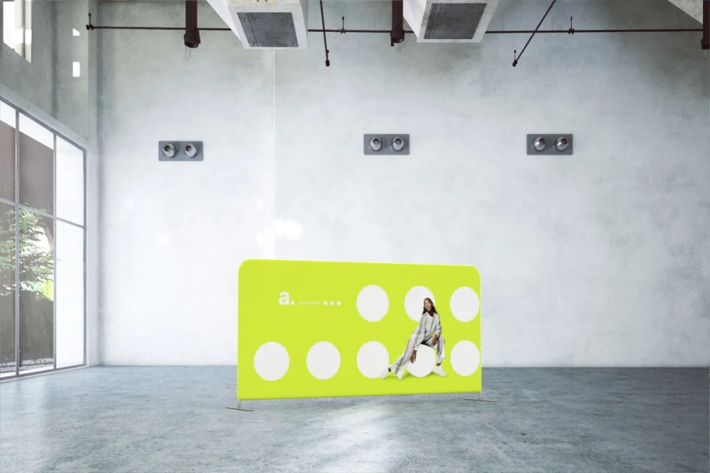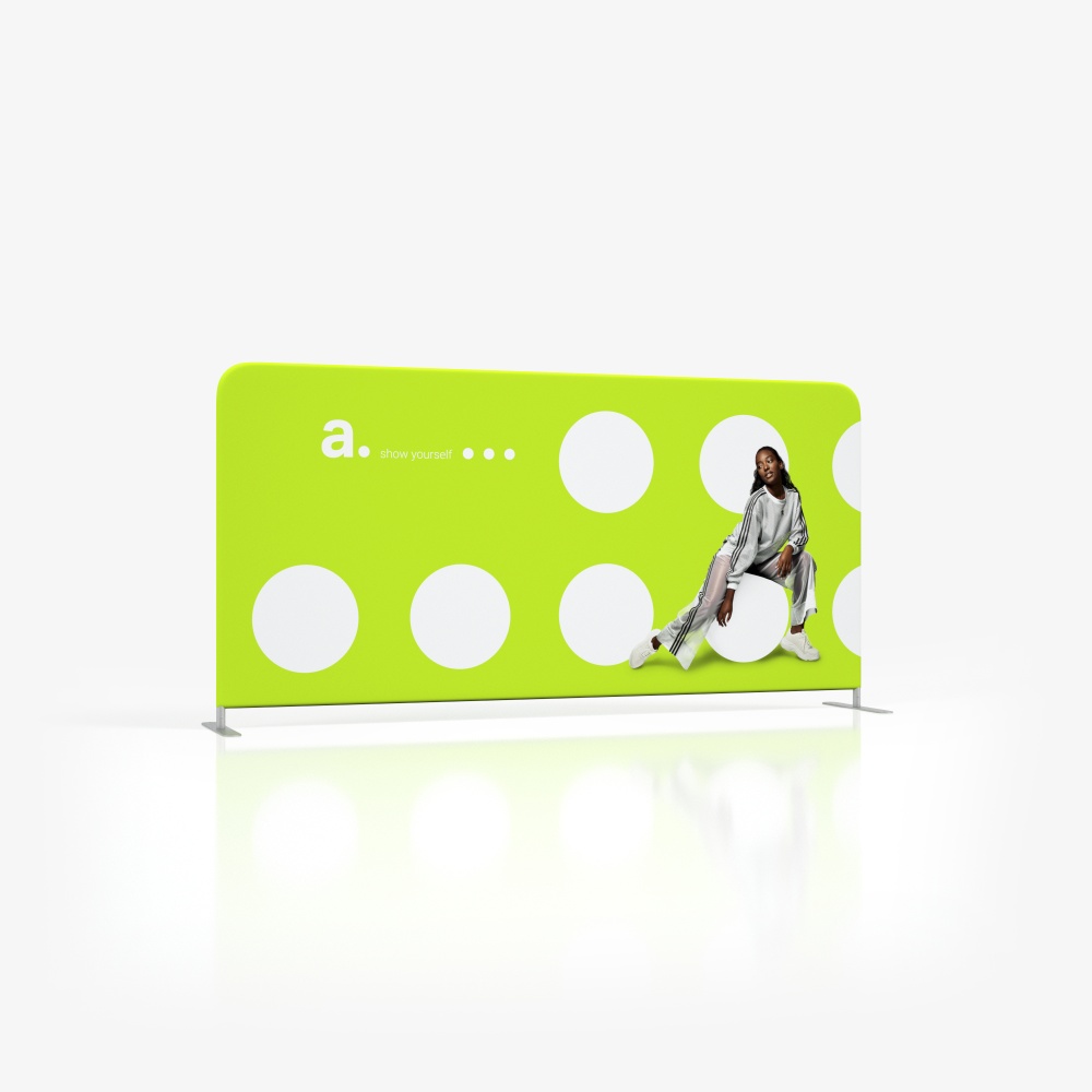 The adWall Vario Horizontal allows for easy graphic replacement, making it adaptable to your needs. Simply order a new fabric with the desired print and apply it to the existing frame. A single partition can be used for years across various campaigns and promotions.
