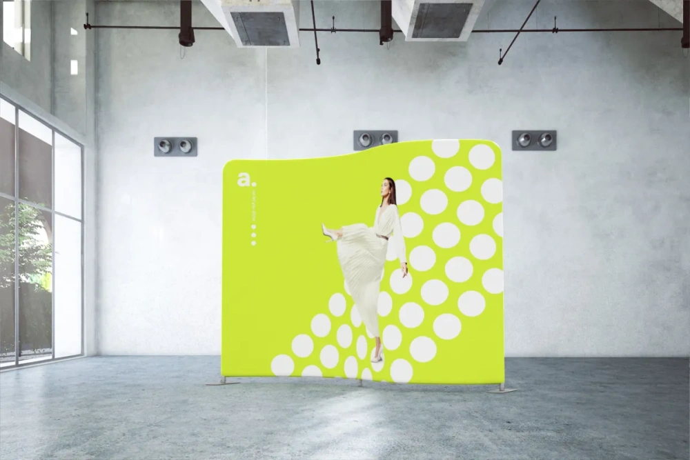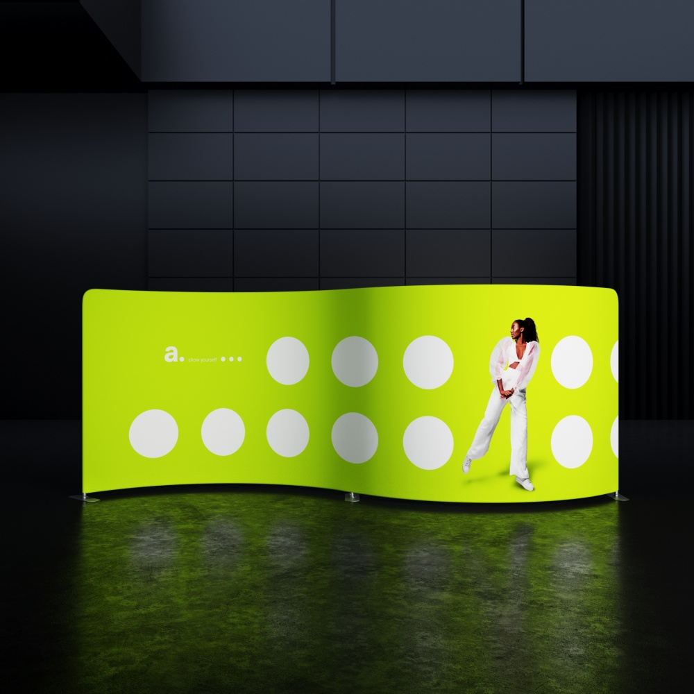 The corporate events photo backdrop adWall Vario Serpentyna stands out with its wavy shape, which not only catches the eye but also adds dynamism to any space. This innovative design ensures your advertising message becomes more visible and memorable.